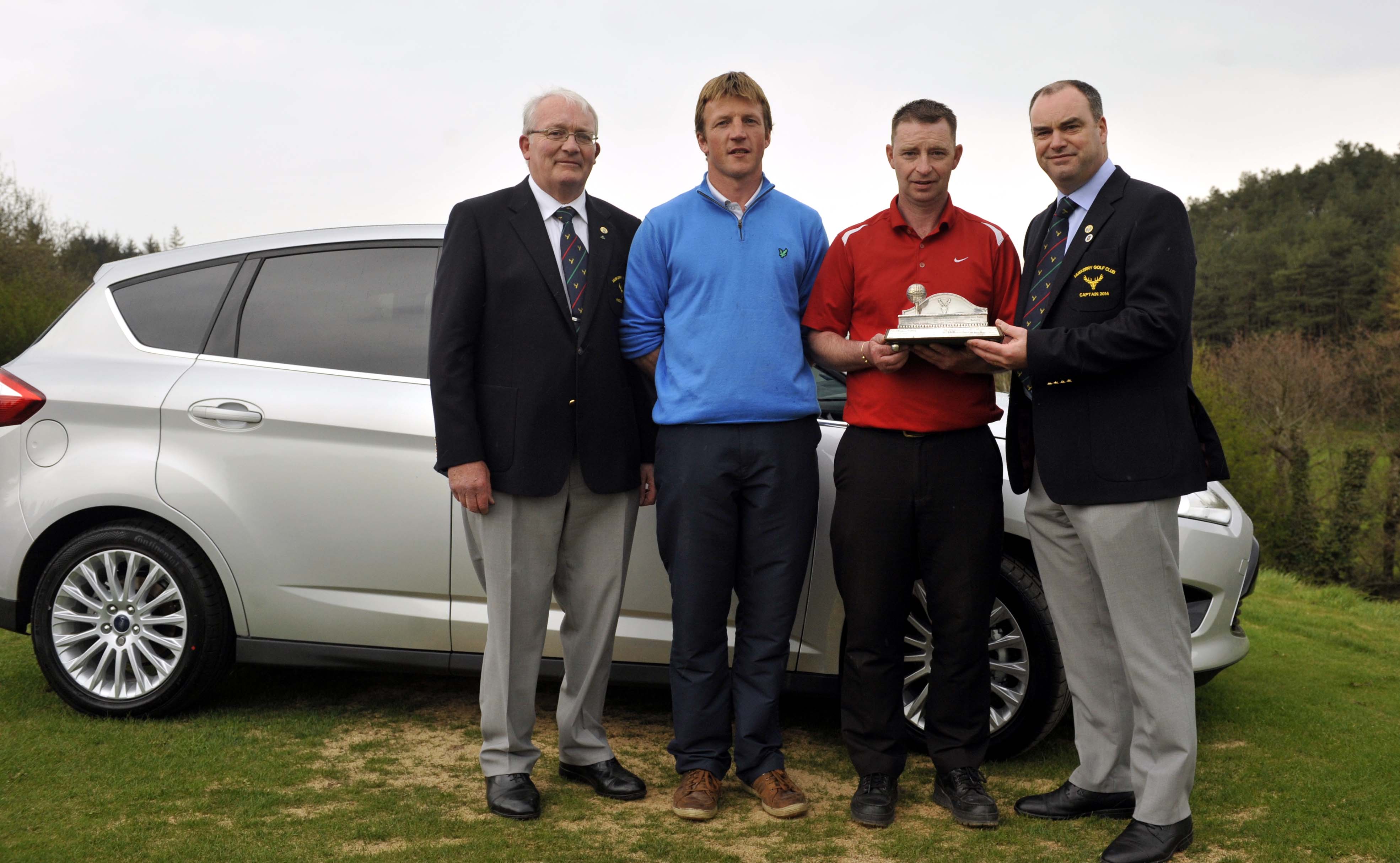 REPRO FREE 20.04.2014 Thomas Healy, captain Muskerry Golf Club, presenting the Cork Junior Scratch Perpetual Trophy- sponsored by Henry Ford and Son- to John Maguire, Mitchelstown Golf Club. Also included are runner up, John O’Mahony, Muskerry GC and Dr. Pat Turner, President.
